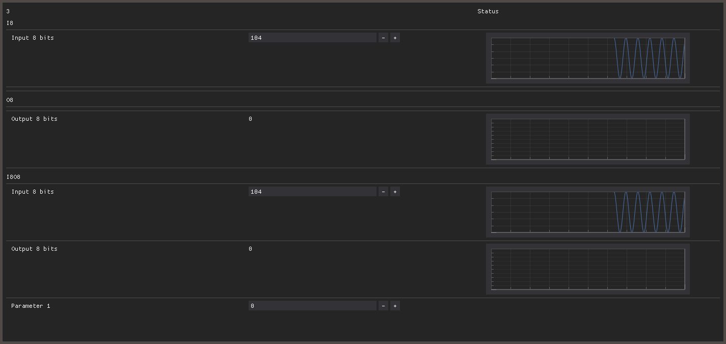 All signals are 8-bit values. The IO8 module also contains one configurable parameter.